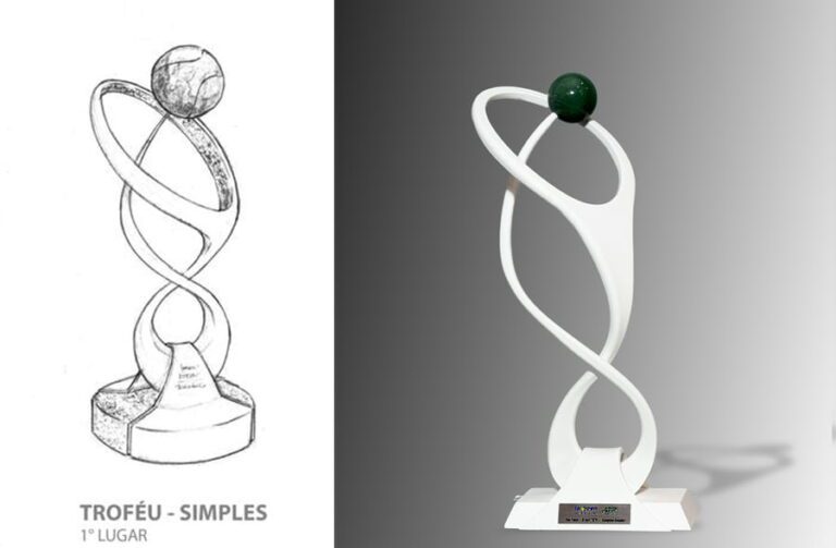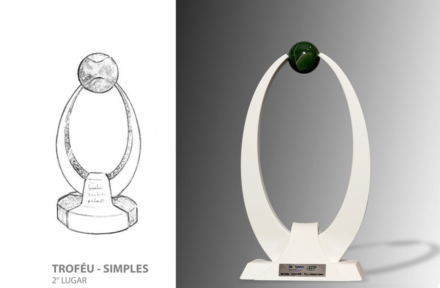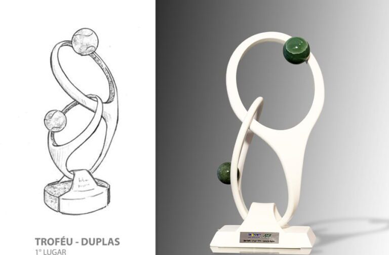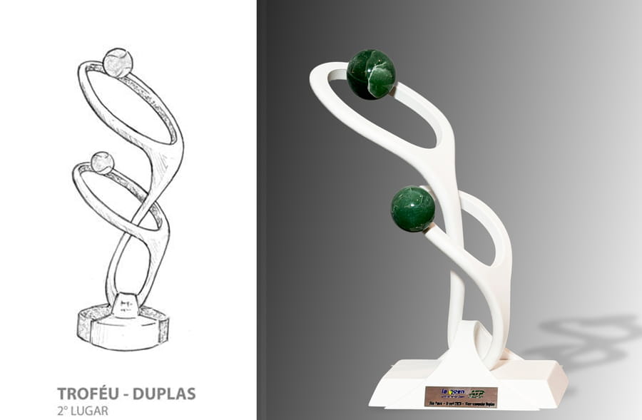Para as duplas, o troféu foi inspirado nas raquetes entrelaçadas, representando a parceria e a união entre os atletas. As formas conectadas em equilíbrio traduzem a essência da disputa em duplas, enquanto a bola de tênis em pedra natural brasileira reforça nossa identidade e estética.