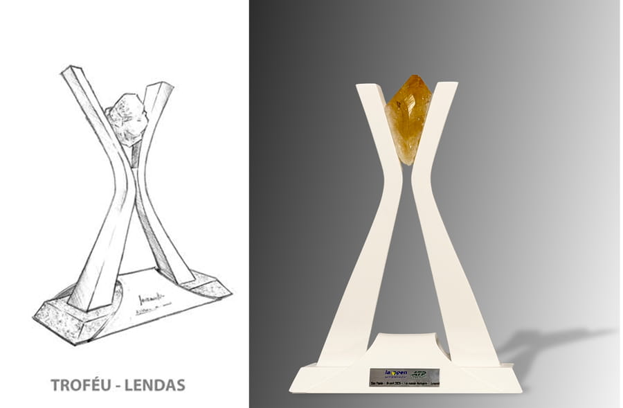 Para homenagear as lendas do tênis presentes no evento, criei um troféu especial inspirado na Ponte Estaiada, um dos marcos arquitetônicos mais reconhecidos de São Paulo. A estrutura do troféu remete às linhas elegantes e à imponência da ponte, conectando simbolicamente as pessoas na capital paulista. No centro, inseri uma pedra preciosa Citrino Amarelo, cuja tonalidade dialoga com as cores da bandeira brasileira e simboliza a riqueza mineral do país.